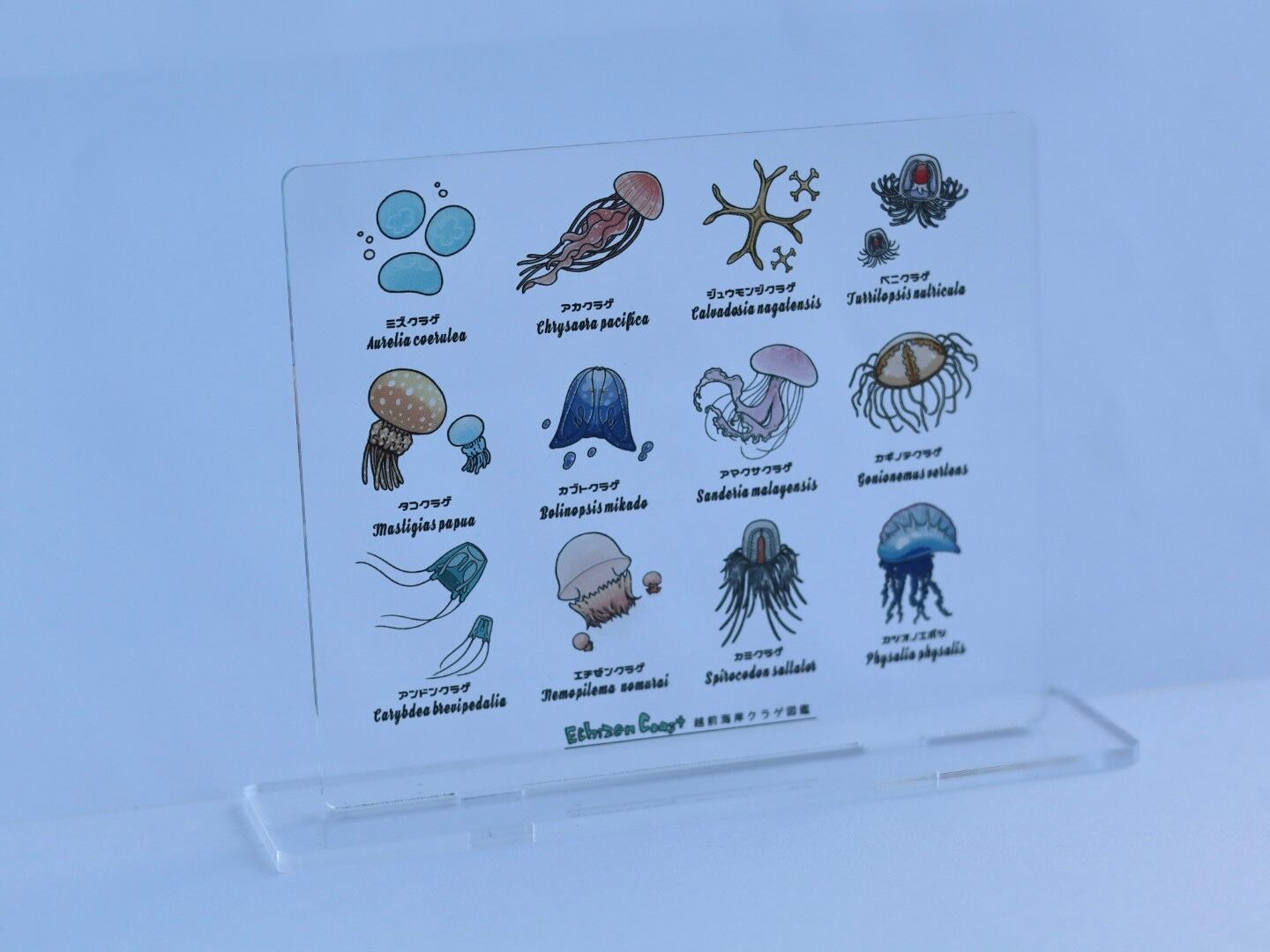 こちらは、くにみクラゲ公民館オリジナルデザインによる、12種類のクラゲを楽しめるアクリルスタンドです。